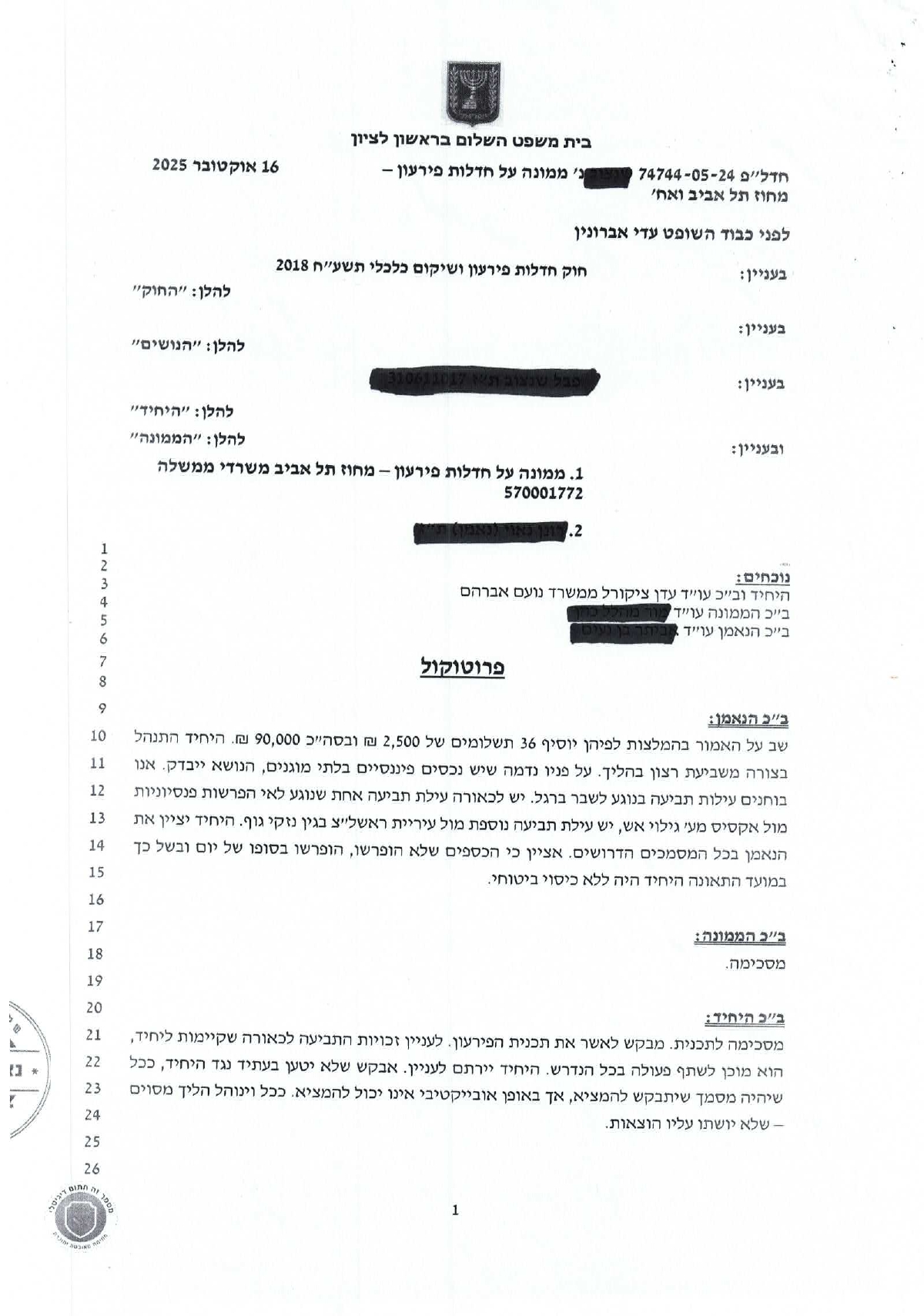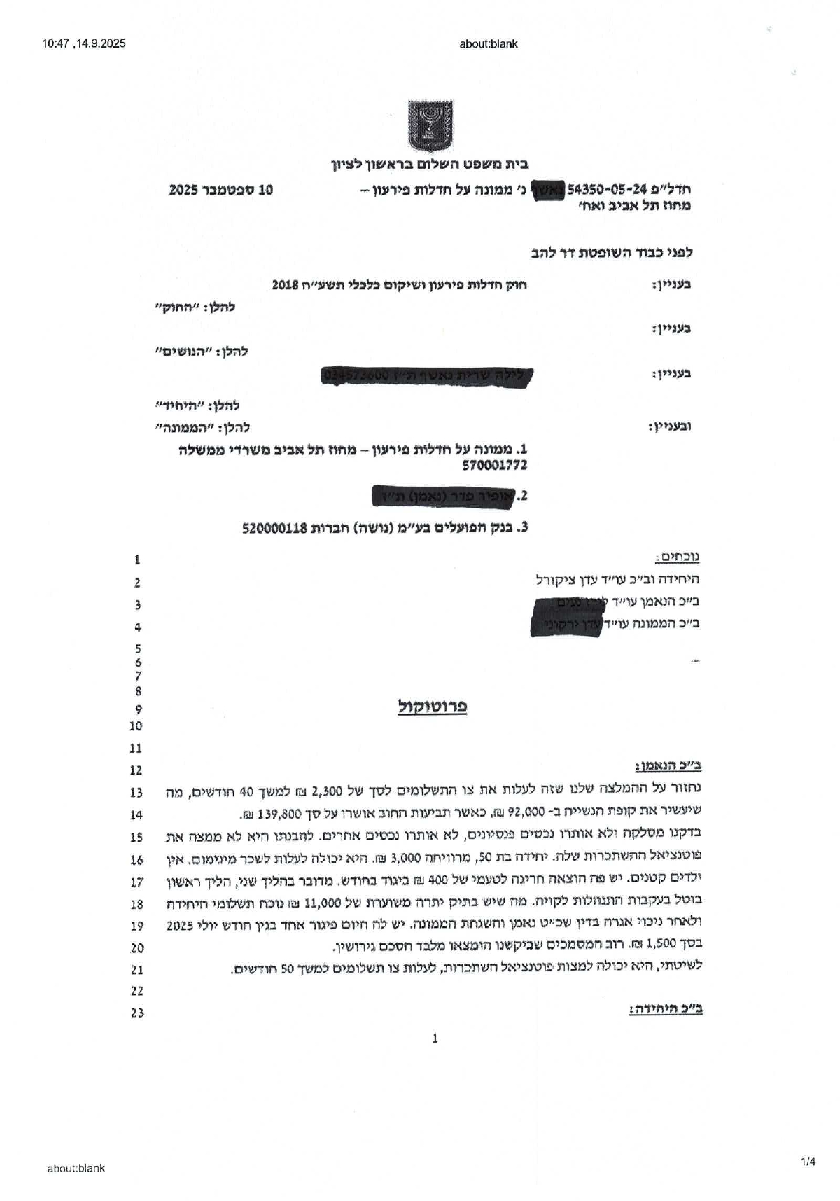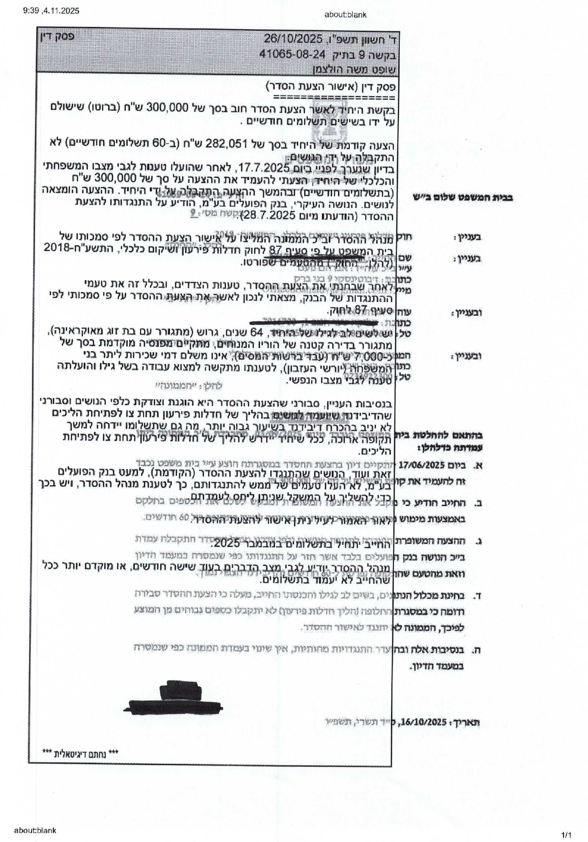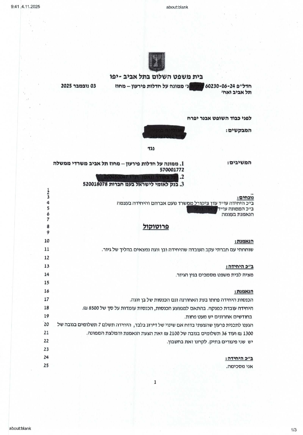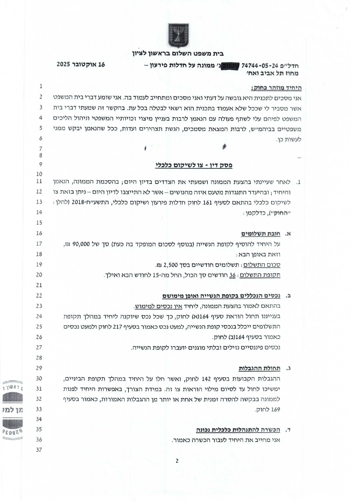 אז נכנסנו לפעולה. לקחנו את כל המספרים, הצגנו תמונה כנה של המצב הכלכלי, ובנינו תוכנית שבית המשפט יכול לאשר. הגשנו בקשה לצו שיקום כלכלי בבית המשפט בראשון לציון, עם הצעה הגיונית: 2,000 ש"ח למשך 36 חודשים בלבד.