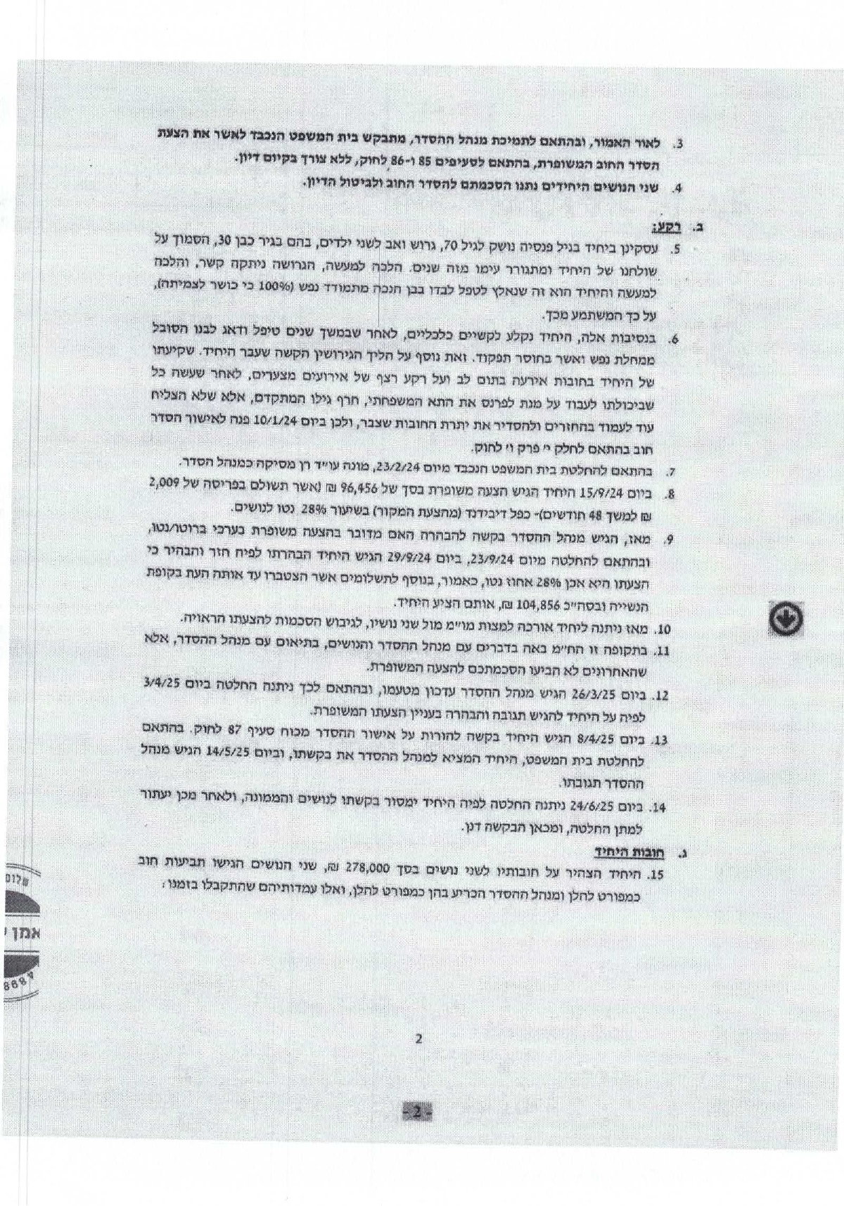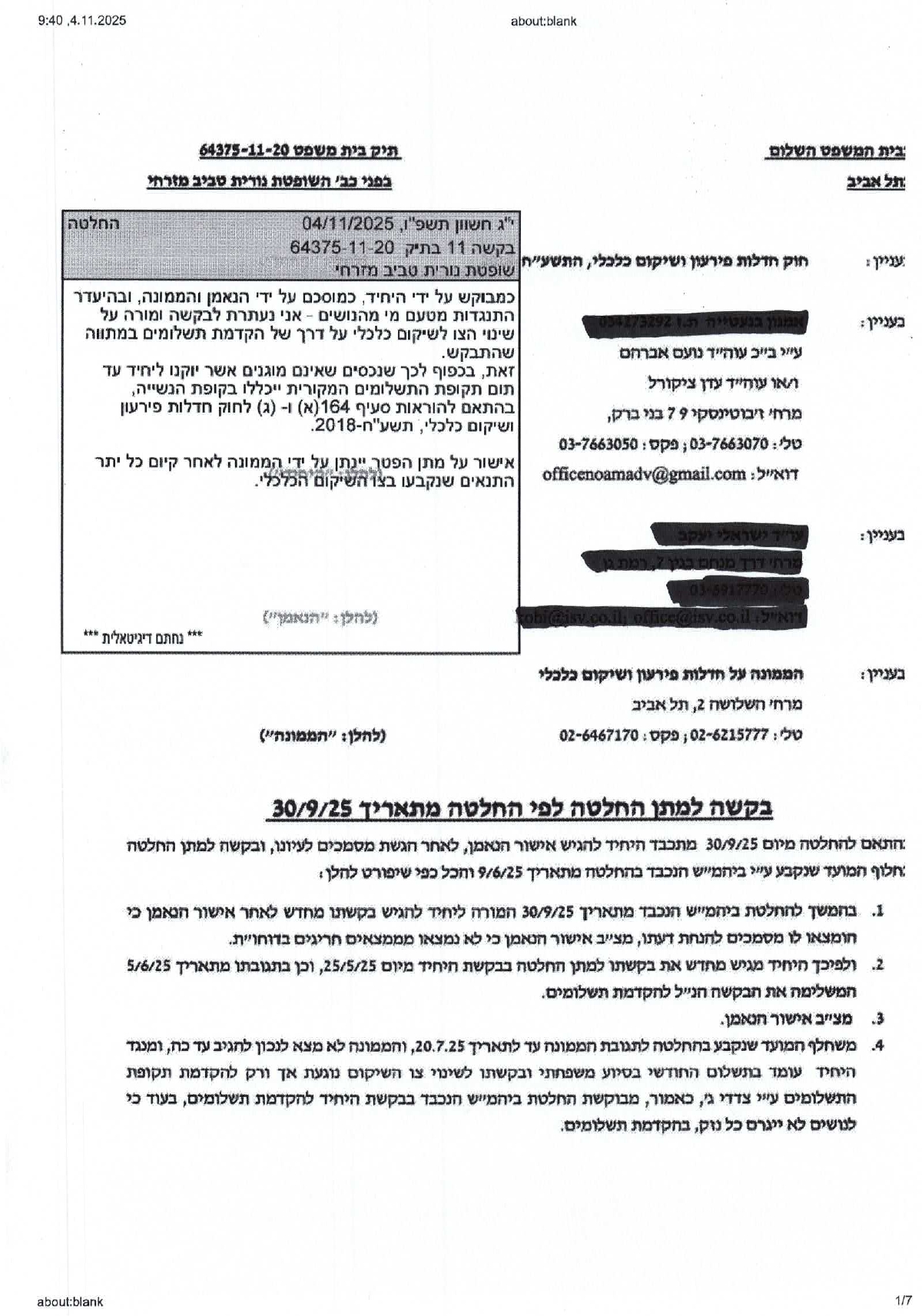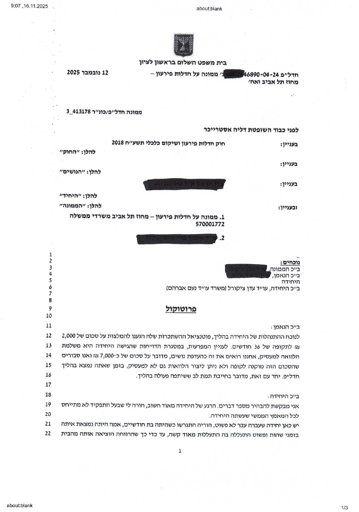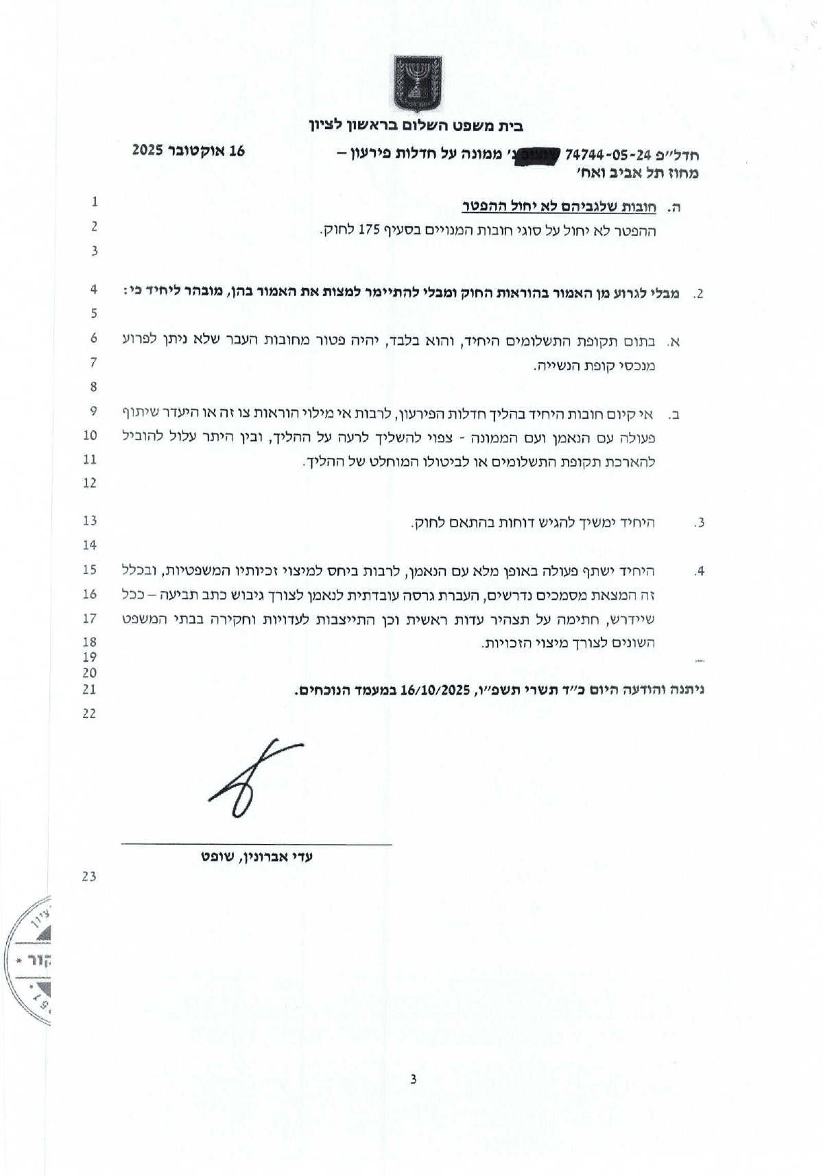 אז נכנסנו לפעולה. לקחנו את כל המספרים, הצגנו תמונה כנה של המצב הכלכלי, ובנינו תוכנית שבית המשפט יכול לאשר. הגשנו בקשה לצו שיקום כלכלי בבית המשפט בראשון לציון, עם הצעה הגיונית: 2,000 ש"ח למשך 36 חודשים בלבד.